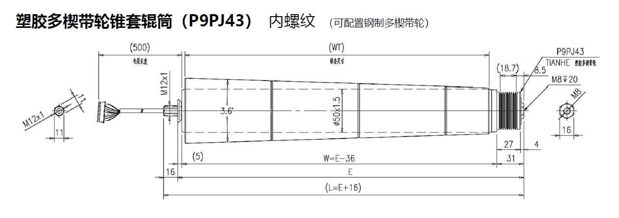 電動(dòng)輥筒 塑膠多楔帶輪錐套輥筒(P9PJ43) 內螺紋 (可配置鋼制多楔帶輪)